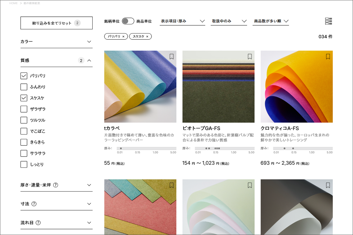 色相・彩度・明るさから色を選べるカラーピッカーをはじめ、「パリパリ」「ふんわり」「しっとり」などの質感(全9種)、模様の種類(全8種)、特徴(全11種)、機能(全7種)などを組み合わせて検索が可能です。用途に合った厚さや模様の大きさ・凹凸度、光沢感なども含めて、求める条件に近い紙へ一気に絞り込みができます。検索結果は、人気順・五十音順・商品数順などに並べ替えも可能です。