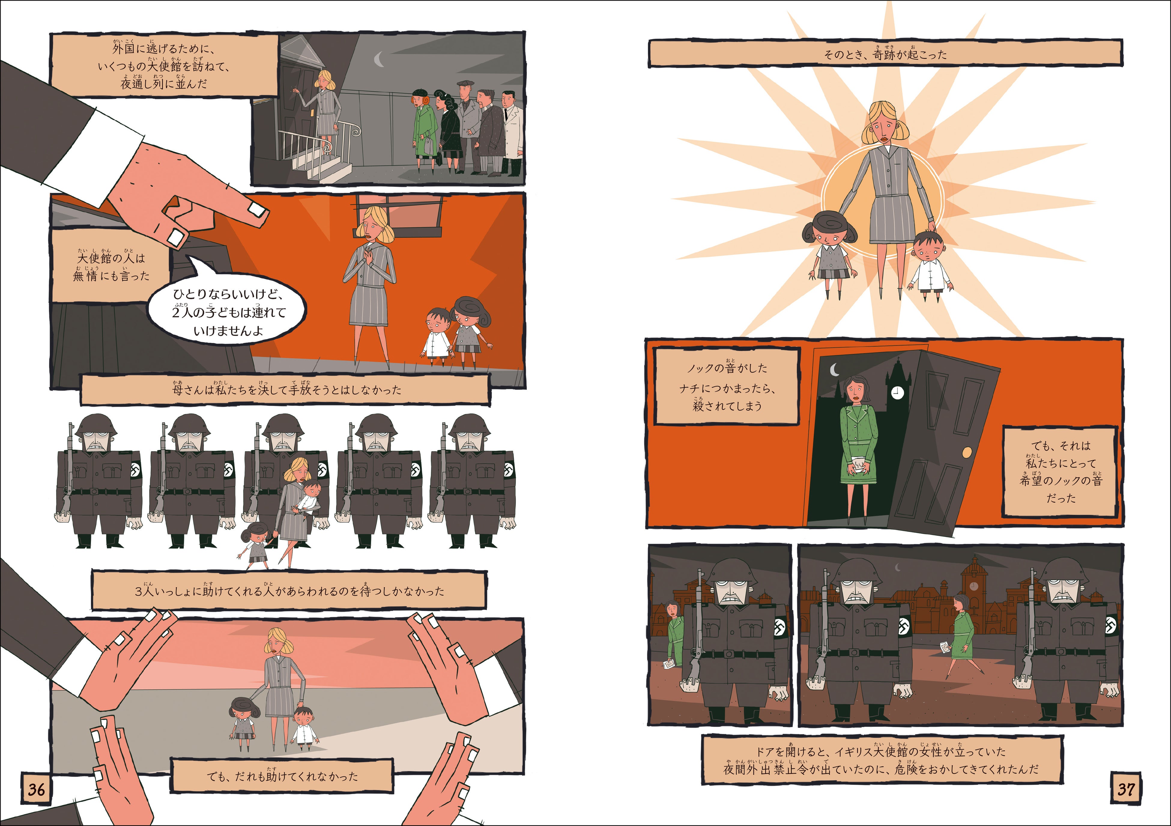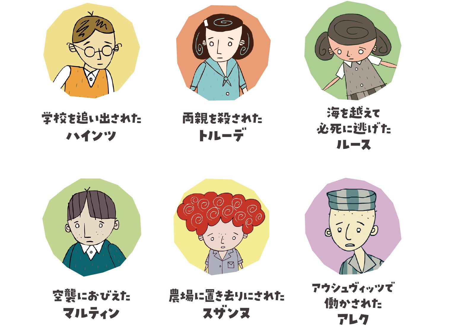 ホロコーストと呼ばれるこのできごとを生きぬいたハインツ、トルーデ、ルース、マルティン、スザンヌ、アレクの6人の子どもたちが、このような悲劇を起こさないためにはどうすればよいのか、物語の中で教えてくれます。