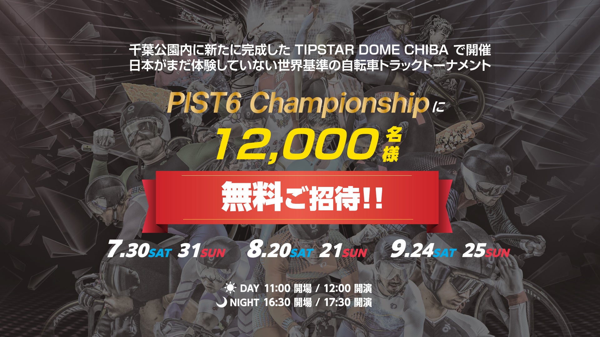 千葉市主催の自転車トラックトーナメント「PIST6 Championship(以下、PIST6)」では、より多くの方にPIST6をお楽しみいただけるよう、夏休み特別企画として7~9月開催レースにて「無料招待Day」を実施いたします。下記対象レースにご応募いただいた方の中から抽選でDAY・NIGHTそれぞれ1,000名様、合計12,000名様をご招待いたします。たくさんのご応募お待ちしております。