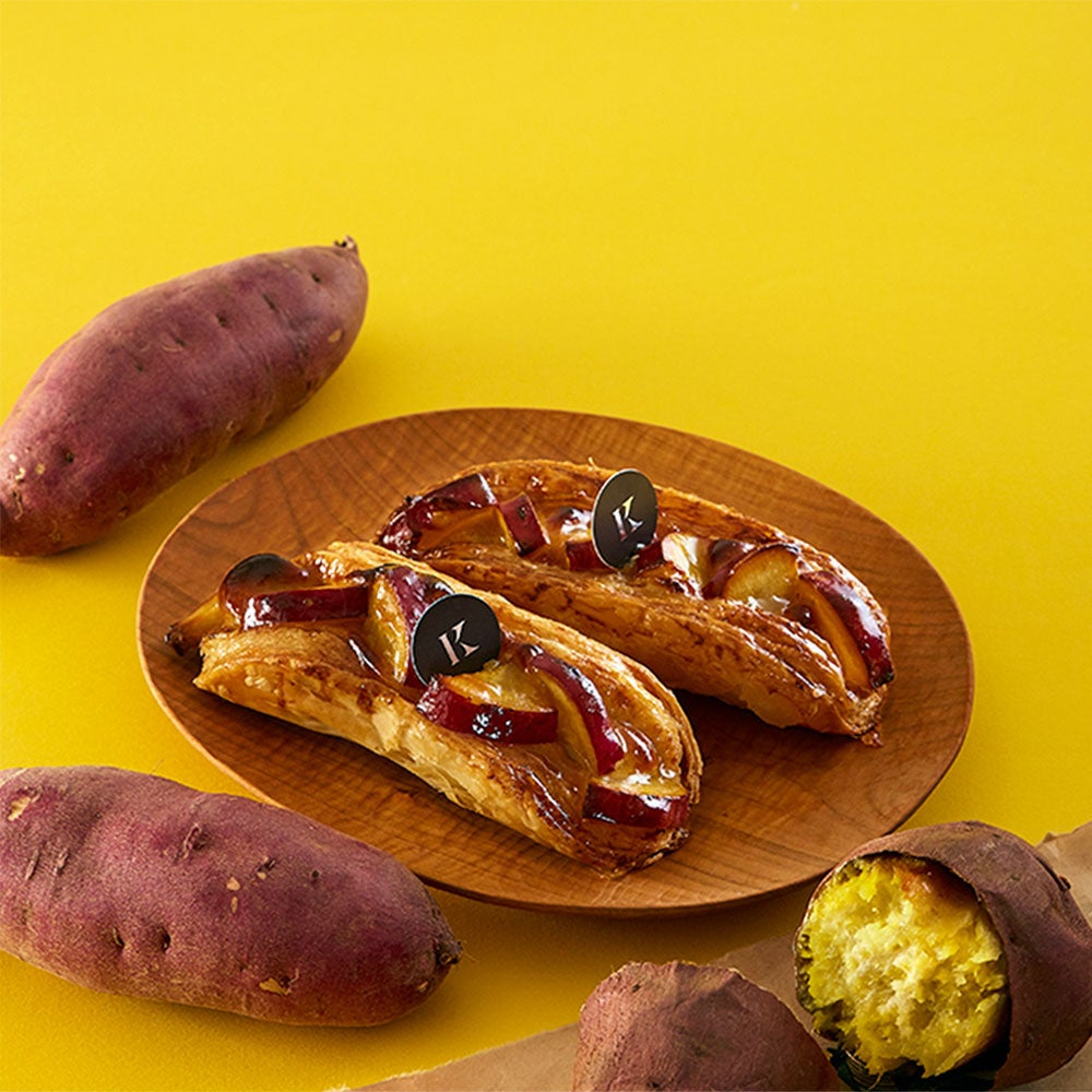 2度焼したサクサクのパイに、さつまいものペーストとカスタードクリームを合わせたフィリングを詰め、甘く煮たさつまいもをのせた秋限定の味わい。