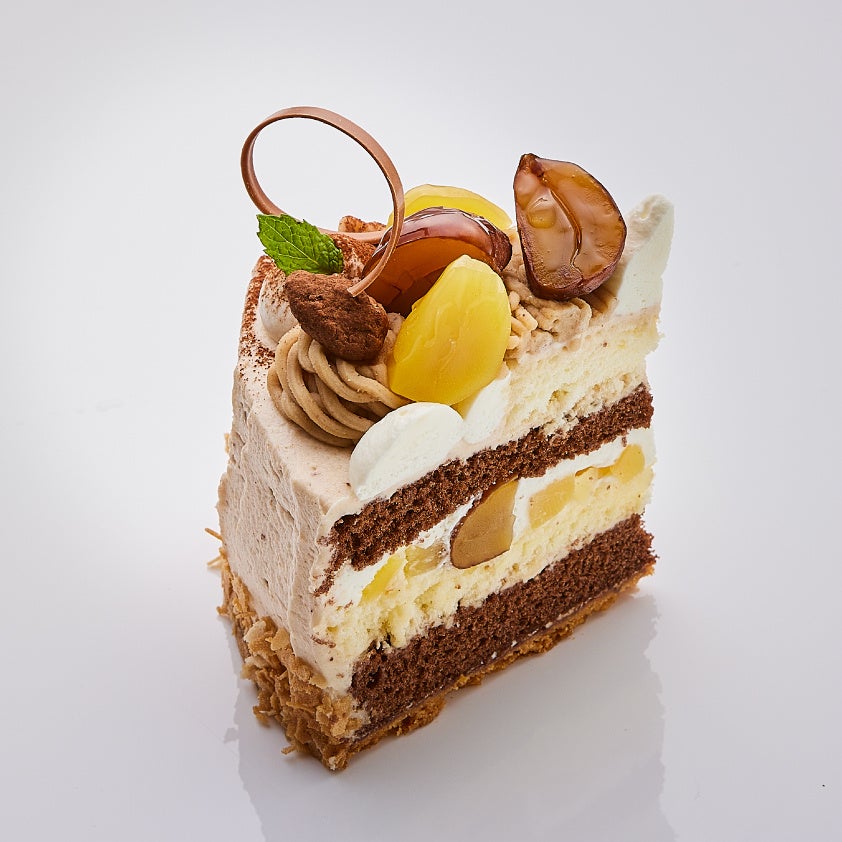 スポンジとココアスポンジで2種類の栗と生クリームをサンドし、風味豊かな美味しさのケーキになりました。