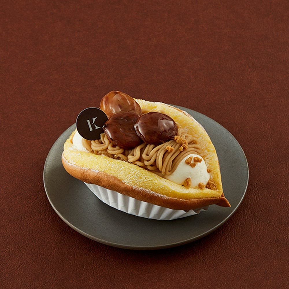 マロンペーストに渋皮栗をのせて、こだわりのオムレット生地の中には求肥とつぶあん、刻んだ栗を入れ贅沢に仕上げました。