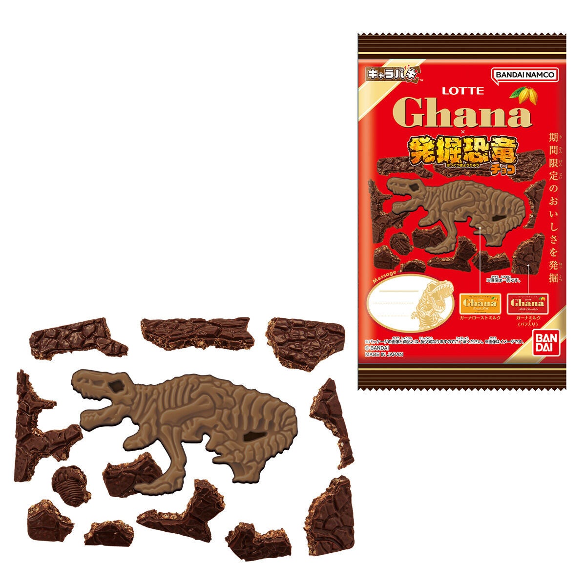 バレンタインのせいにして、『化石』をデザインしたキャラパキ「発掘恐竜チョコ」が、なんとロッテ「ガーナチョコレート」と期間限定コラボ!「ガーナミルク」「ガーナローストミルク」を使用しており、「ガーナチョコレート」を味わいながら、型抜き遊びも楽しめます!