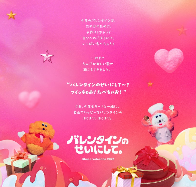 さらに、「バレンタインのせいにして。」に対して、ohora、212キッチンストア、HIPSHOP、フリューなど今年も多くの企業・ブランドからも共感・賛同をいただき、企業の枠を超えて、ガーナとのコラボレーション企画や各社による「バレンタインのせいにして。」をテーマにした商品販売・キャンペーン展開などが順次展開されていく予定です。1月30日(木)には、新WEB動画公開、さらにバレンタイン当日に向けてSNSキャンペーンなども実施予定です。ガーナがお贈りする今年のバレンタイン企画に、引き続きご注目ください。