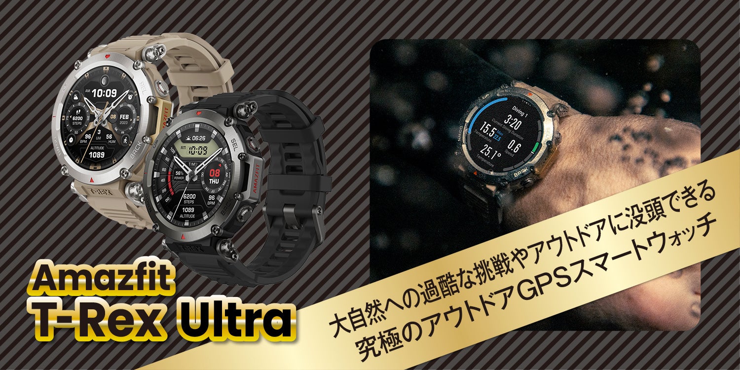 マップ表示&ナビゲーション、ダイビング用アクセサリー規格認証取得、バッテリー最大20日&多様なモード選択が可能。大自然への過酷な挑戦や休日のアウトドアに没頭する、そんなライフスタイルを支える最高のパートナー。それが究極のアウトドアGPSスマートウォッチ「Amazfit T-Rex Ultra」です。