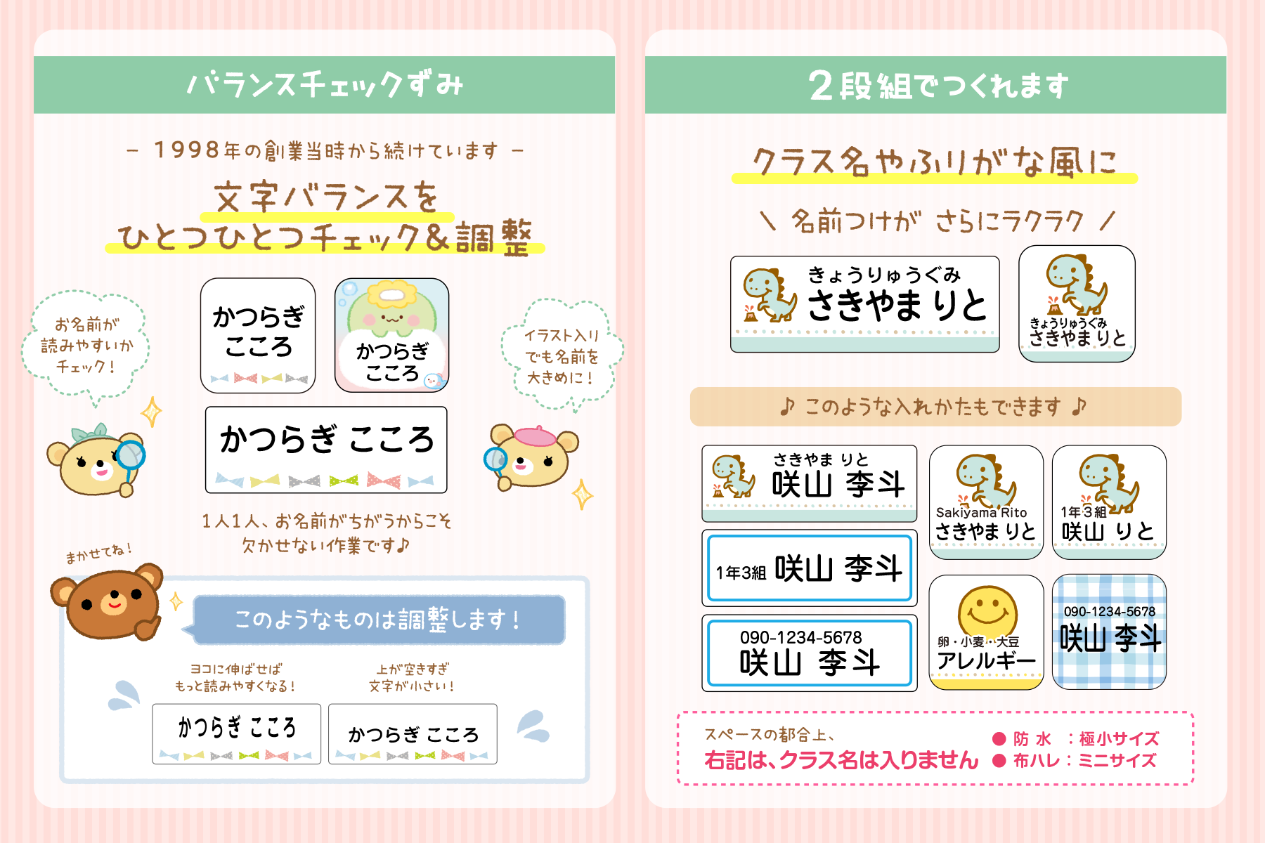 『毎日のお仕事や育児に追われている、パパ・ママのお手伝いが少しでもできれば…』という想いで、22年にわたり、お名前シールをはじめ名入れ商品の販売を通じて、仕事や育児に多忙な保護者のみなさまの入園・入学準備のお手伝いをしてまいりました。これからもさまざまなアイデアを発信し、名前つけをラクに楽しく、使う人々が笑顔になるアイテムを作り続けてまいります。