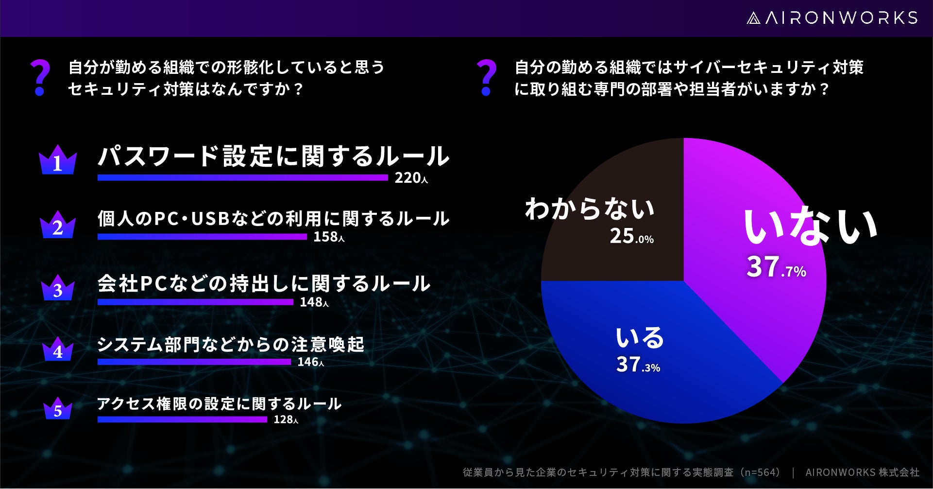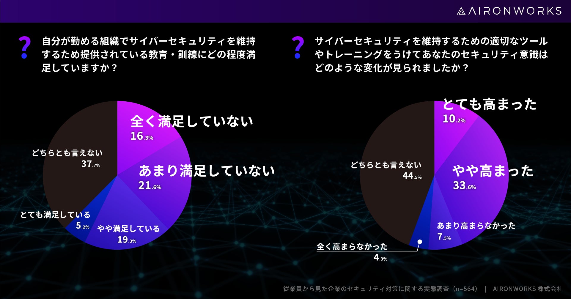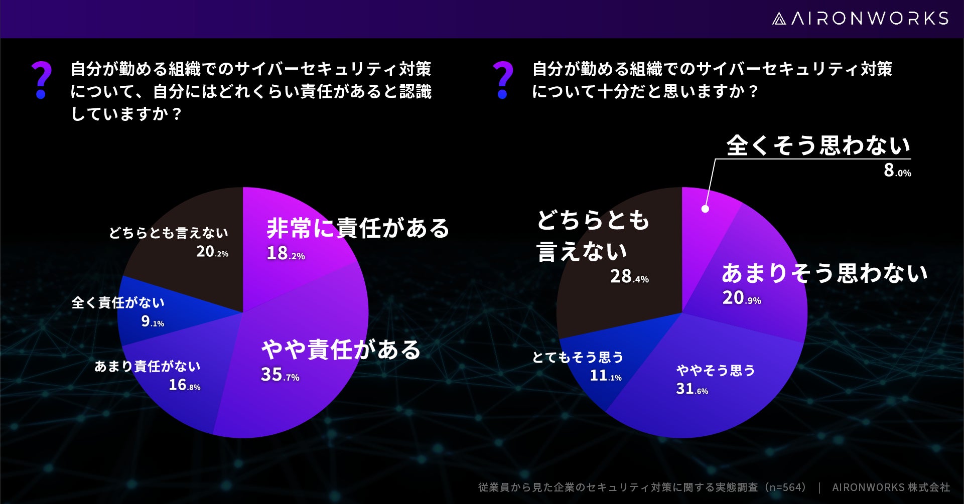 AironWorks株式会社 (本社:東京都港区、代表取締役:寺田 彼日、以下「AironWorks」) は、20代~60代の全国の男女564人を対象に従業員から見た企業のサイバーセキュリティ対策に関する実態調査を実施しましたので調査結果についてお知らせいたします。