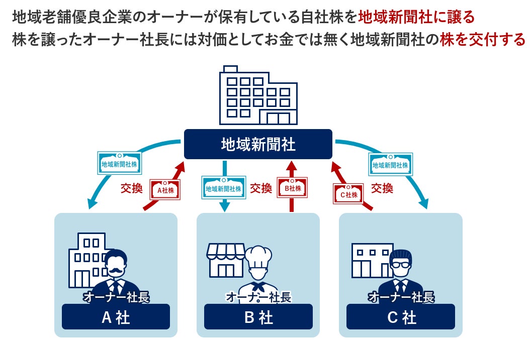 地域共創プラットフォームとは、「株式交付」(100%取得の場合は「株式交換」)という手法を用いて、非上場の地元優良企業と当社がグループ会社として協調・共存していくことを可能にする仕組みです。具体的には、地元優良企業のオーナーが自社株式を当社に譲渡し、その対価として当社の株式を受け取ります。これにより、当該企業は当社のグループ会社となり、オーナーは親会社である当社の株主となります。法的には子会社の位置づけとなりますが、実際には上下関係のないDAO型(分散型)組織としての運営を想定しています。そのため、地元優良企業は上場会社である当社の信頼性・資金調達力・人材ネットワークなどを活かしながら、従来どおり自立的な経営を継続できます。結果として、地域の中小企業が抱える後継者問題や相続問題といった深刻な課題の解決にも寄与します。