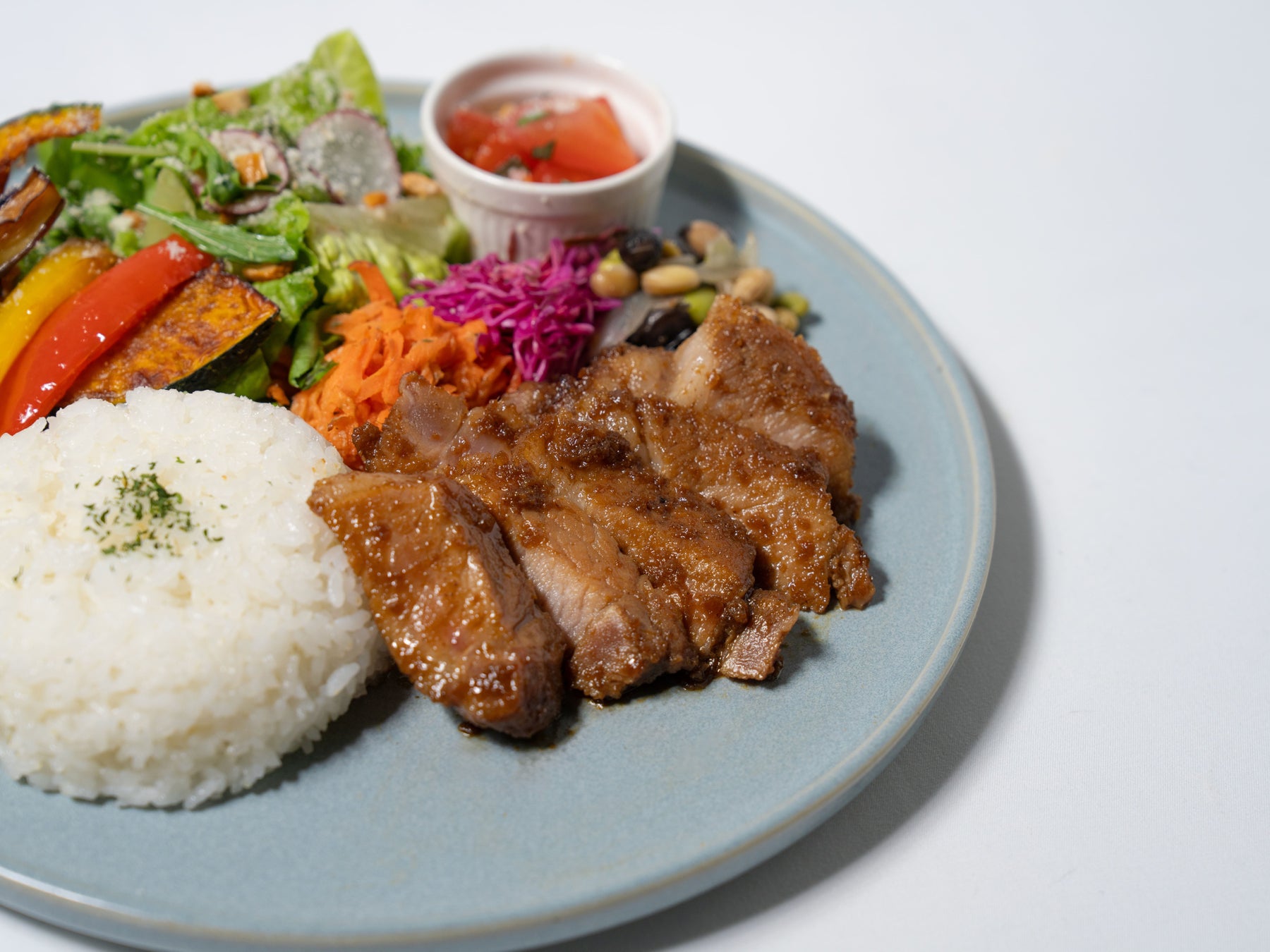 ごはんどろぼうの名の通り、生姜をきかせた甘辛い味付けでごはんが進みます。たっぷりのお野菜とラペ2種、手づくりデリとご一緒にバランスよく仕上げました。