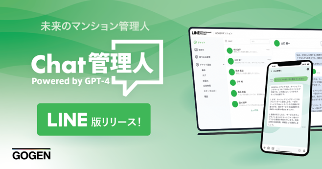 GOGEN株式会社(本社:東京都港区、代表取締役CEO:和田 浩明)は、OpenAI社が提供する「ChatGPT」を活用した、マンション管理に纏わる相談・お問い合せ対応が可能なチャットサービス「Chat管理人 powered by GPT-4」(以下、Chat管理人)において、LINEヤフー社が提供するコミュニケーションアプリ「LINE」をユーザーインターフェースとしてご利用いただける「Chat管理人 powered by GPT-4 LINE版」(以下、LINE版)を開発し、提供を開始したことをお知らせいたします。本サービスは、AI技術の最新鋭であるGPT-4を活用することで、24時間365日、住民のお問い合わせに即応が可能で、マンション管理会社の業務負担を大幅に軽減します。