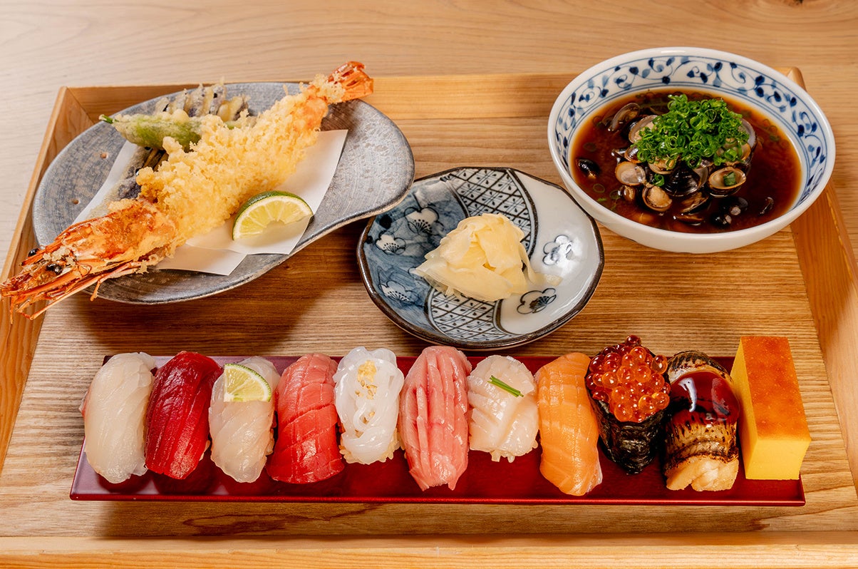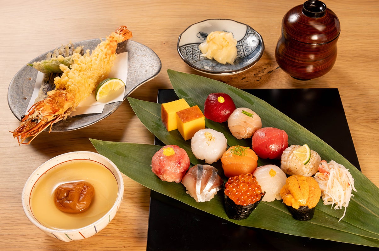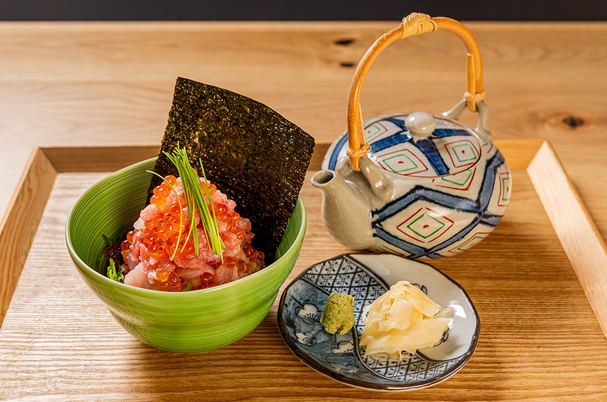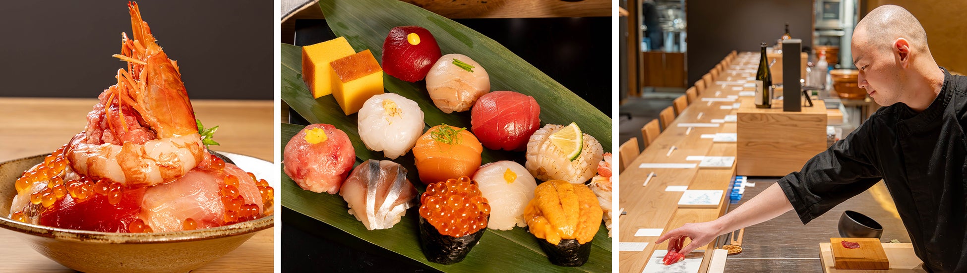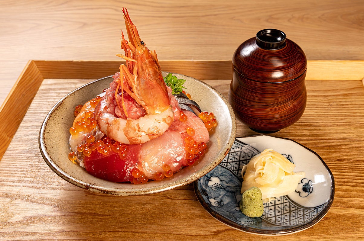 メニューは、経験豊かな熟練職人とともに新人職人も開発に加わり、作り上げたこだわりの4品をご用意します。大ぶりの甘えびや極上南鮪など新鮮なネタの数々を贅沢に盛り込んだ「魁鮮丼」は、最後にお出汁を追加してお茶漬けとして〆ることも出来る満足感たっぷりのメニュー。1日10食限定で提供する「海鮮手毬寿司 天婦羅 茶碗蒸し付き」は、女性や小食の方でも多くのネタを楽しめるようにと開発した、ひと口サイズの手毬寿司12種が並ぶ見た目も美しい一品です。いずれも上質な素材をふんだんに使ったお値打ちメニューです。