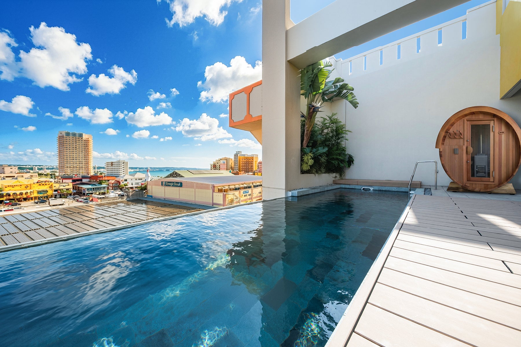 沖縄の風、天然温泉、そして木の香りに包まれる至福。当ホテルは「滞在そのものが、心身を再生する旅であってほしい」という想いから、客室内に完全プライベートなバレルサウナを導入いたしました。「サウナ×プール×天然温泉」が三位一体となった沖縄屈指のプライベート空間は、一日の始まりを清々しく、一日の終わりを深い静寂で満たします。単なる宿泊を超えた、五感を呼び覚ます新しいリゾートステイをご提案いたします。