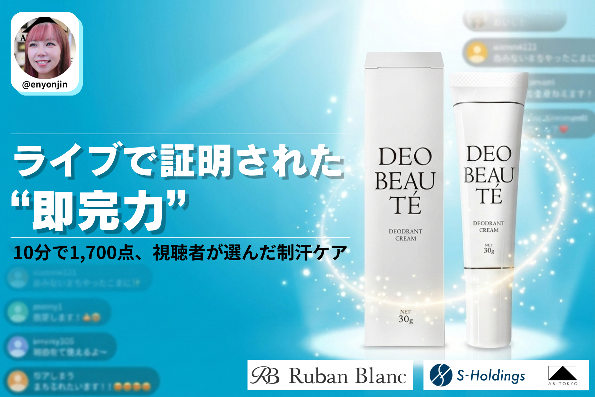 ライブコマース事業、ブランド事業、AI事業などを展開し、日常と未来を彩る最高の体験を創造する株式会社Sホールディングス(本社:東京都品川区、代表取締役CEO: 燕 咏靖)は、当社運営のアパレルブランドABITOKYOが企画・配信するTikTokライブコマース「燕チャンネル」において、株式会社ハウワイ(本社:兵庫県西宮市、代表取締役:辻田裕也)が展開するボディケアブランド「リュバンプラン」の薬用制汗クリーム「デオボーテ」を販売いたしました。その結果、配信開始から約10分で用意した1,700点が完売。ライブコマースにおける高い熱量と製品への信頼を実証する結果となりました。