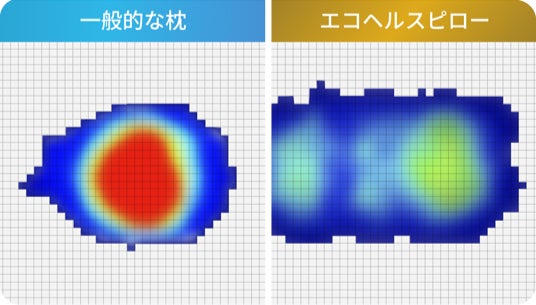 一般的なウレタン枕(左図)と比較すると、エコヘルスピロー(右図)は頭部から首にかけての圧力が分散されていることがわかります。