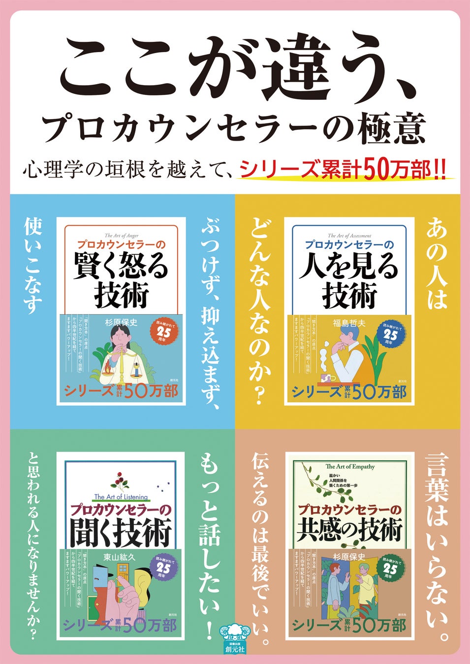 2000年刊、東山紘久『プロカウンセラーの聞く技術』からはじまる、創元社の心理学書シリーズ。何かと「話す技術」が取り沙汰される「話し方本」界隈の中で、「だいじなのは『話す』より『聞く』こと」という当時としては斬新なテーマで、「聞く」のプロであるカウンセラーが、人間関係のコツをわかりやすく解説。ロングセラーとなりました。