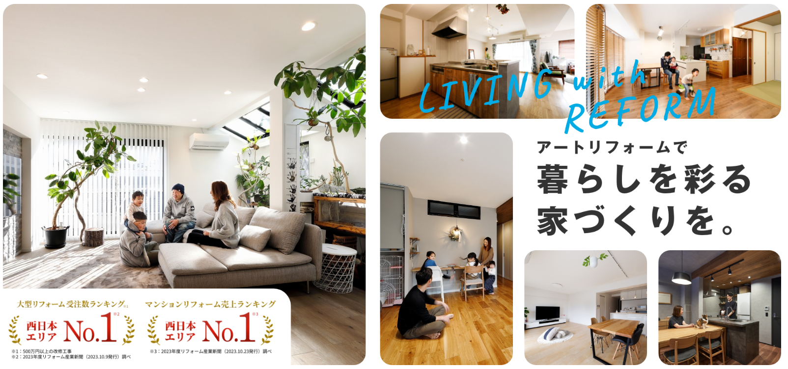創業70年、年間6000件、累計15万件のリフォーム工事を施工。現在、関東、関西、東海、九州に展開しています。大手不動産仲介会社の各社のパートナーとして中古物件購入時のリフォームを手掛けるBtoB事業、WEBや紙面広告、テレビCMなどより反響頂いた顧客へのリフォーム提案を行うBtoC事業を手掛け、利用者数No.1のリフォーム会社紹介サイト「ホームプロ」においては13年連続で西日本第一位の表彰を頂いております。今後もミッションである「暮らしにアートリフォームを。人生にアートリフォームを。」の実現を目指し、事業推進に取り組みます。