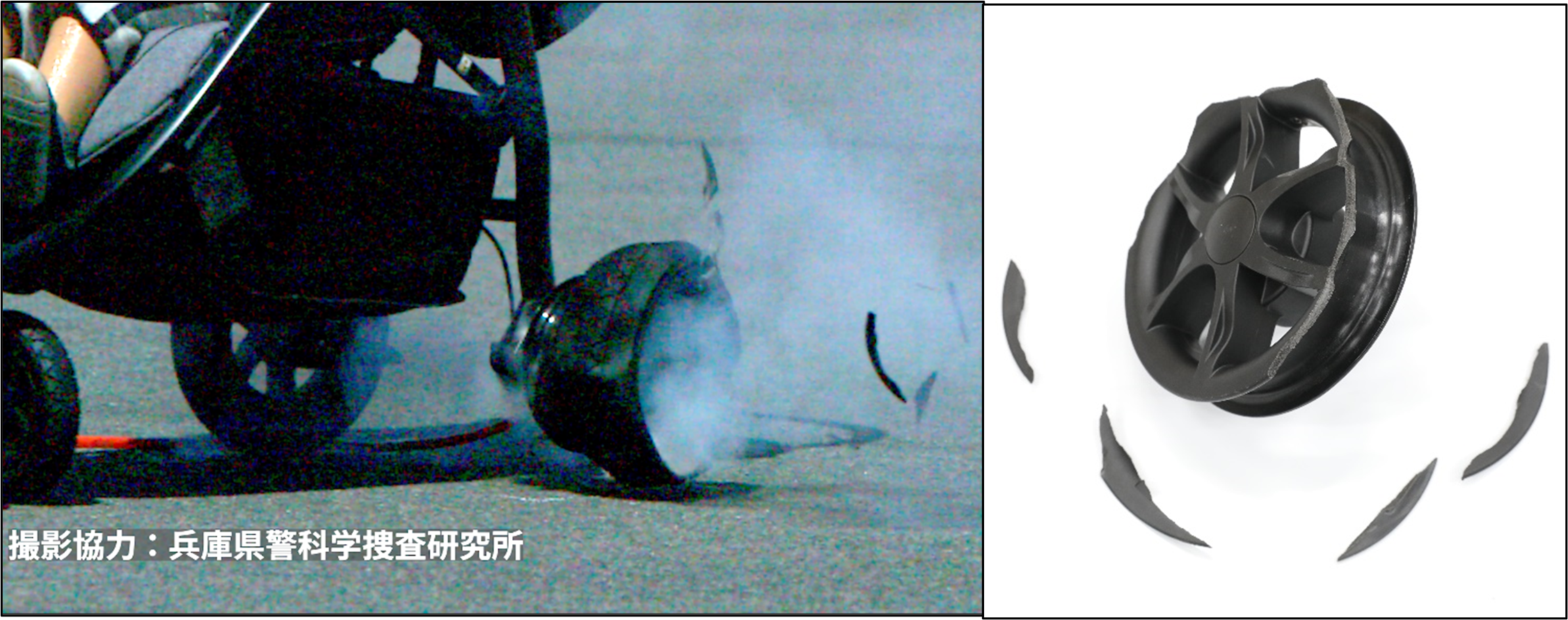 【実験写真】使用者の空気の入れすぎによりタイヤ※1が破裂し、車輪の破片が飛散