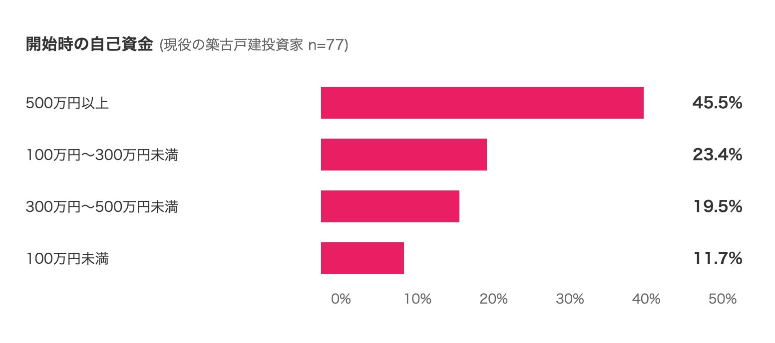 一方で「500万円以上」も45.5%存在しており、築古戸建投資が一律に“少額で誰でも容易”という話ではありません。とはいえ、参入時点の資金レンジが幅広く、少額から着手できる投資行動が一定規模で存在している点は、特徴として捉えられます。
