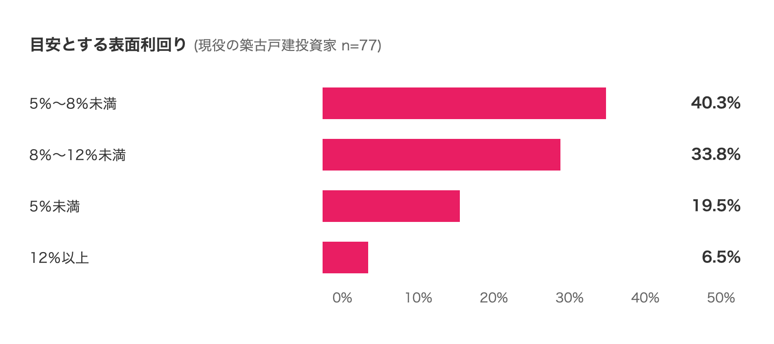 ただし「8%以上」(8~12%未満+12%以上)の合計が40.3%であることから、現役の築古戸建投資家は、一定の収益性が見込めない物件は最初から候補に入れにくい行動を取っている可能性が高いと考えられます。
