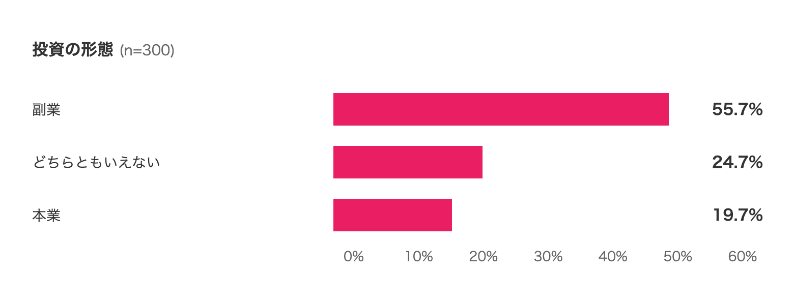 不動産投資は「副業」が主流であり、全体(n=300)の55.7%が副業として運用。