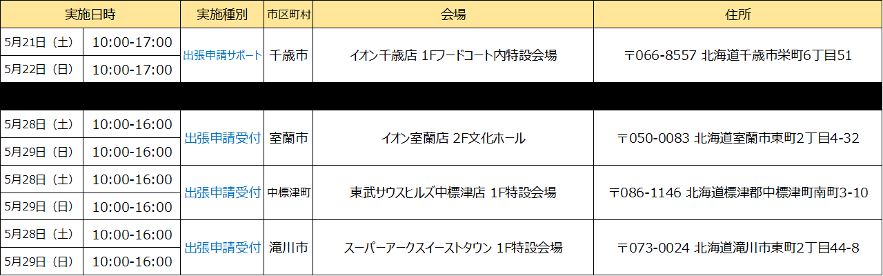 ※開催場所の調整状況や新型コロナウィルスの感染状況等により、「出張申請受付」及び「出張申請サポート」の開催を中止・延期、または実施内容が変更となる可能性がございます。