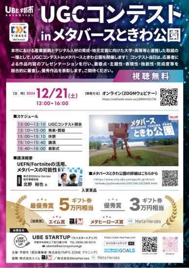 メタバース(XR)、AI、DXを活用して地域課題の解決に取り組む株式会社Meta Heroes(住所:大阪府大阪市、代表取締役:松石和俊、以下「当社」)は、2024年12月21日(土)に山口県宇部市で開催される「UGCコンテスト in メタバースときわ公園」に参加いたします。弊社代表が審査員として参加するほか、弊社クリエイティブディレクターがメタバース技術をテーマにしたセミナーを実施します。
