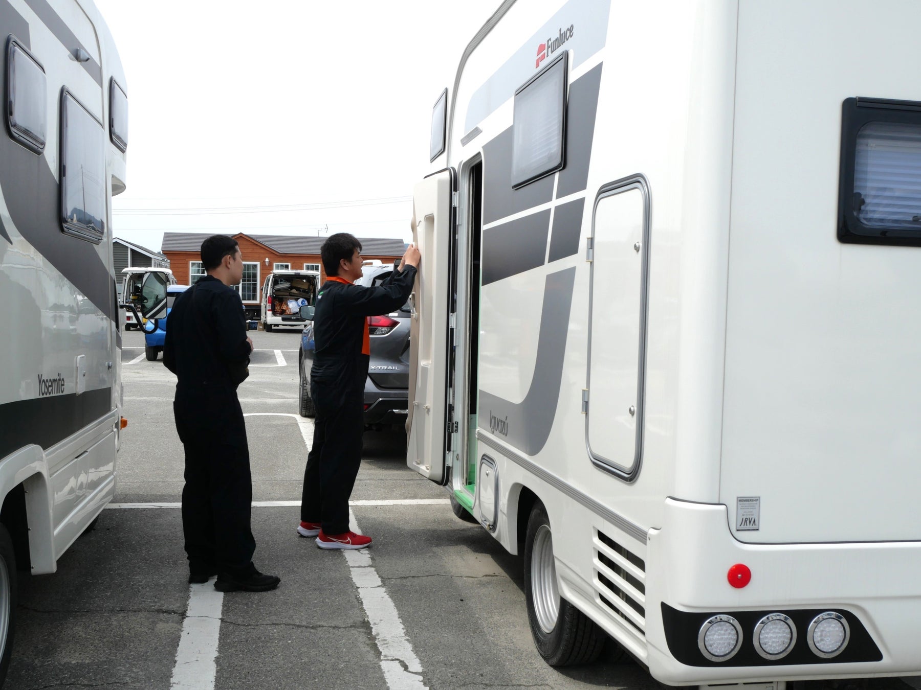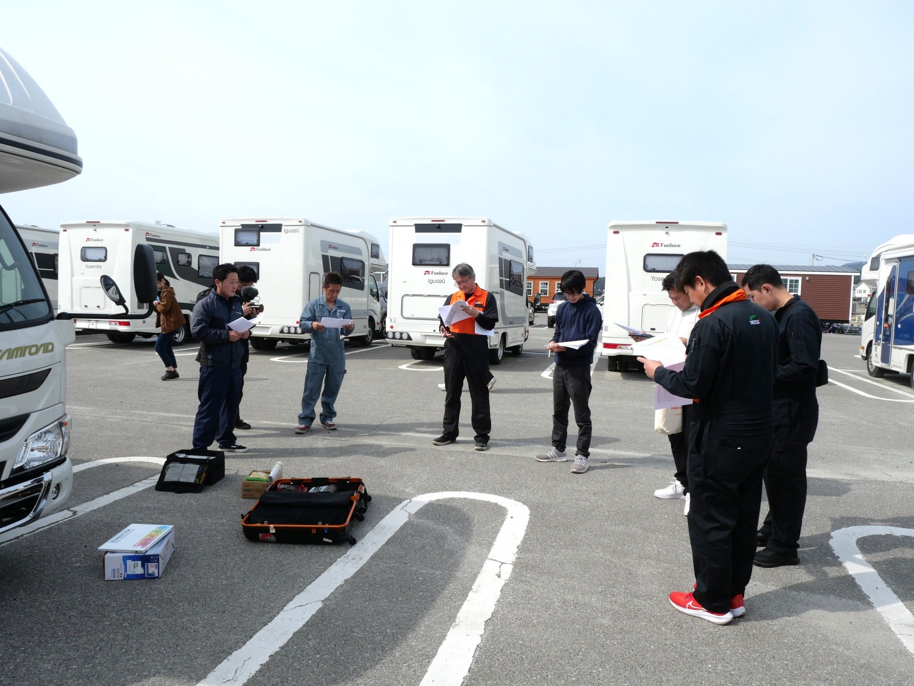 また、日本RV協会(JRVA)では、キャンピングカーをただ貸与するだけではなく、被災地で継続的に安心安全にキャンピングカーを利用して頂くため、「JRVA能登災害RVパーク村支援プロジェクト(以下:JRVA-N.R.S.P)」を発足し、日本RV協会の全国の地域部会から会員企業のスタッフを月に2回現地に派遣し、貸与中のキャンピングカーのメンテナンスを行いました。メンテナンスでは、バッテリーの点検をはじめタイヤの空気圧などの点検及び修理を行い、長い期間でも安心して安全にキャンピングカーを利用して頂くことができました。