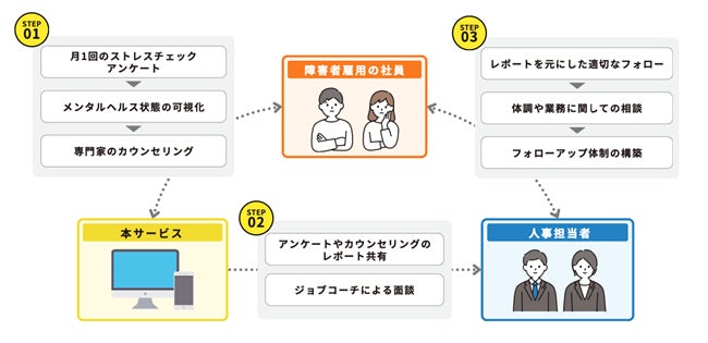 障害者雇用の社員に対して、月1回のストレスチェックアンケートを行い、メンタルヘルス状態を可視化します。可視化された内容から障害者雇用の社員は専門家によるカウンセリングを受けられます。(STEP 01)