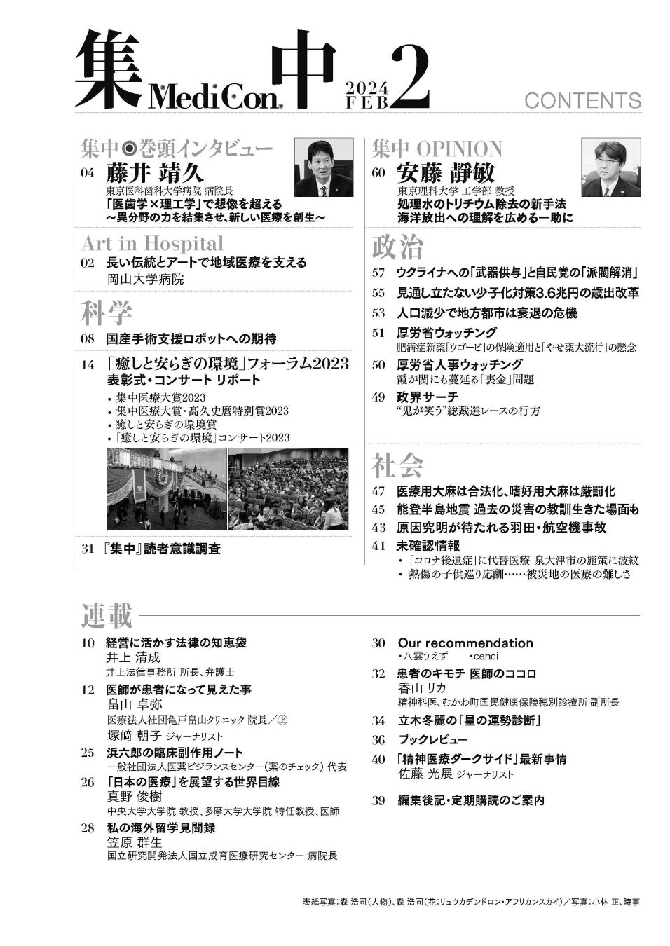 医療情報誌 月刊『集中』2024年2月号 巻頭インタビュー 藤井靖久・東京医科歯科大学病院 病院長/集中OPINION 安藤 靜敏・東京理科大学工学部 教授 他