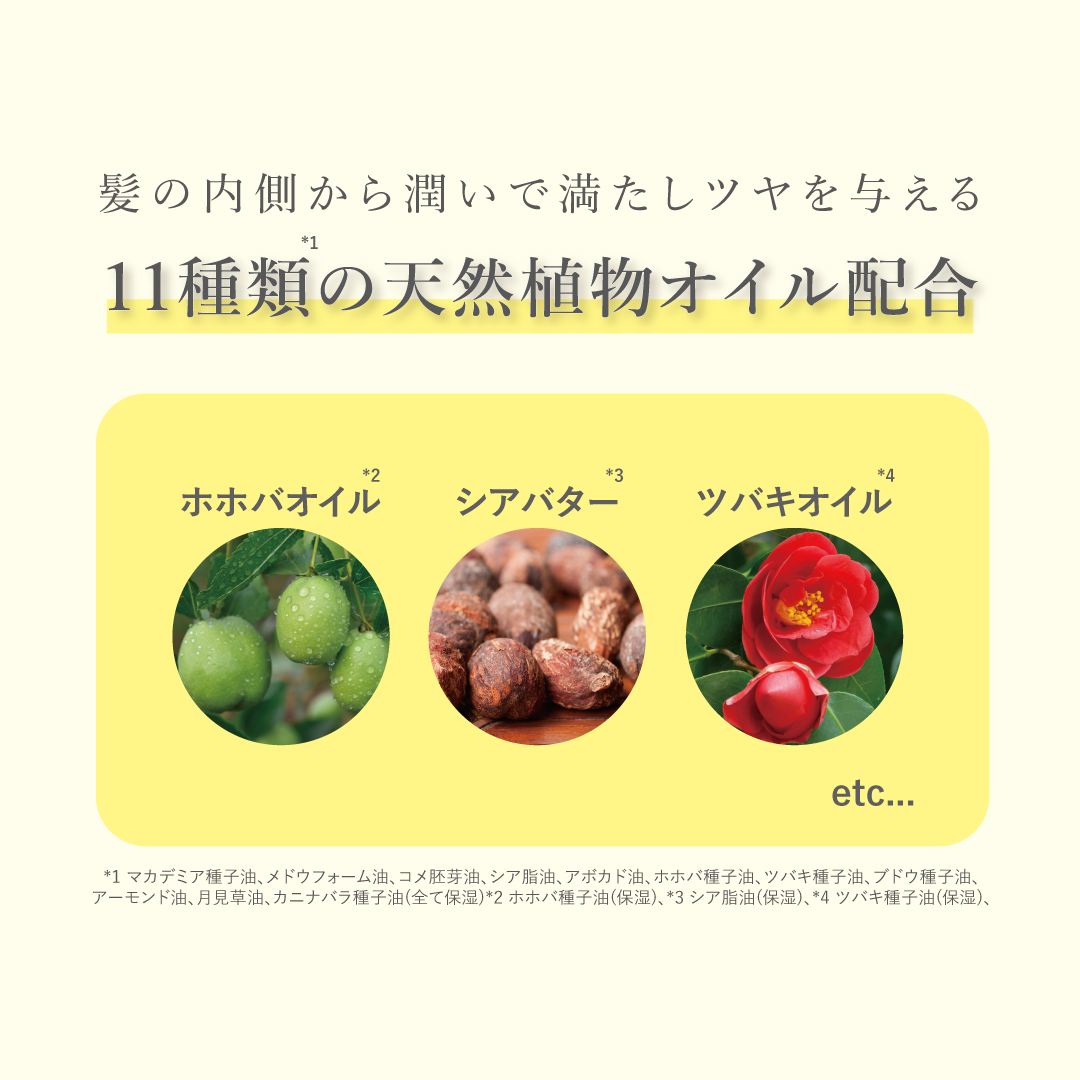 来成分*11 が乾燥や紫外線ダメージから髪を守り、軽やかなまとまりとツヤをキープします。