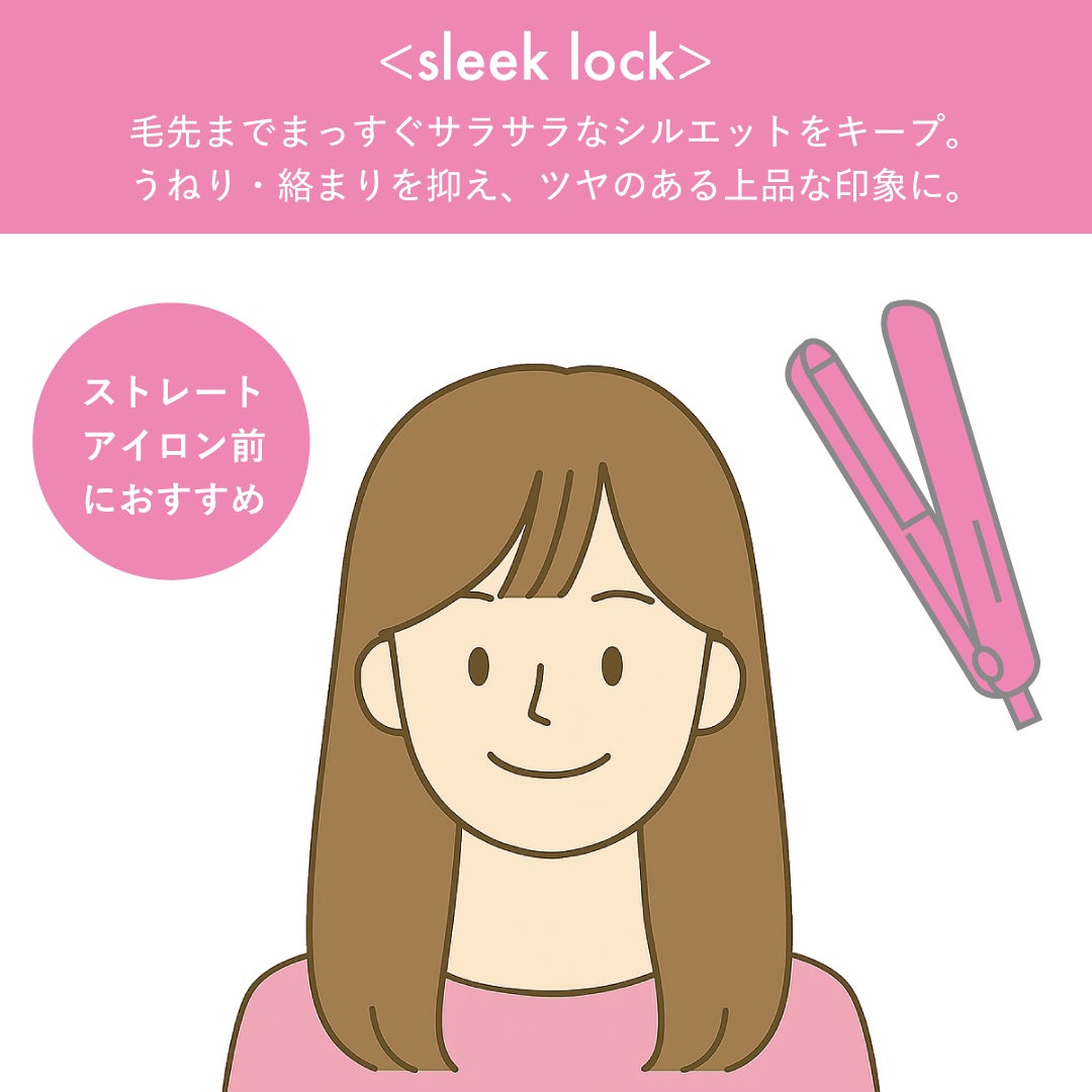 「sleek lock(スリークロック)」は、毛先までまっすぐサラサラなシルエットをキープ。湿気による広がりやうねり・絡まりを抑え、ツヤのある上品な印象に。ストレートアイロンでスタイリングする方に特におすすめ。