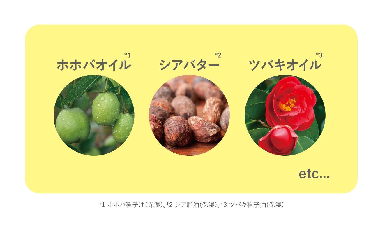 *3 イソステアロイル加水分解シルク(毛髪補修・保湿)、*4 イソステアロイル加水分解コラーゲン(毛髪補修・保湿)*5 アミノエチルチオコハク酸ジアンモニウム(ヘアコンディショニング)、*6 γ-ドコサラクトン(ヘアコンディショニング)、*7 メドフォーム-δ-ラクトン(ヘアコンディショニング)、*8 ホホバ種子油(保湿)、*9 シア脂油(保湿)、*10 ツバキ種子油(保湿)、*11 マカデミア種子油、メドウフォーム油、コメ胚芽油、シア脂油、アボカド油、ホホバ種子油、ツバキ種子油、ブドウ種子油、アーモンド油、月見草油、カニナバラ種子油(全て保湿)