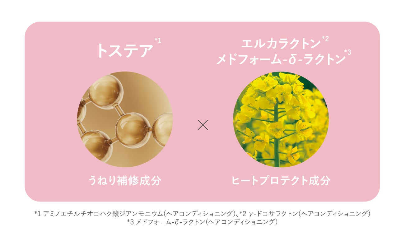 うねり補修成分「トステア*5」が毛髪内部にアプローチし、ドライヤーやアイロンの熱と反応して毛