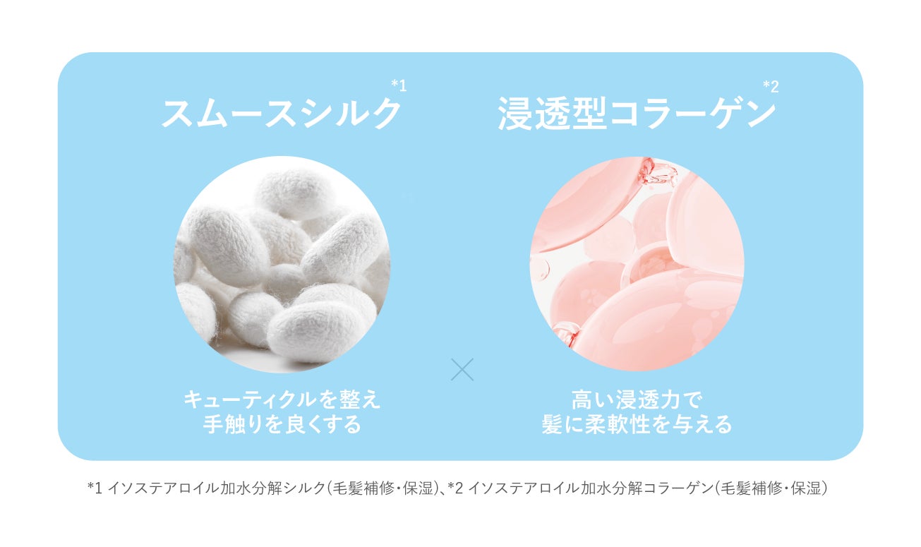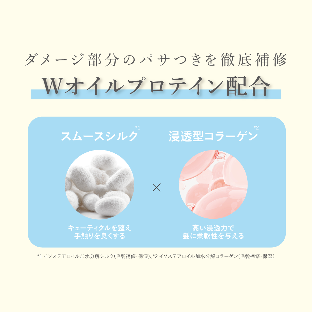 ダメージ補修成分として、髪の構造に類似した「Wオイルプロテイン(スムースシルク*3・浸透型コ
