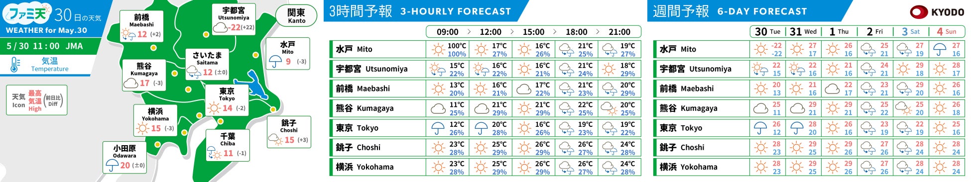ファミリーマート店舗内(一部地域除く)のリテールメディアを運営する株式会社ゲート・ワン(本社:東京都港区、代表取締役社長CEO:藏田 一郎、以下当社)は、ニュースを中心とする情報配信事業を手がける株式会社共同通信デジタル(本社:東京都港区、代表取締役社長:伊地知 晋一)とこれまで総合ニュース(経済、社会、政治、国際、スポーツなど)と全国の天気予報を提供してまいりましたが、デジタルサイネージ設置店舗の拡大と合わせて、2025年3月11日より、エリア毎の気象情報を全国のファミリーマート店舗に設置されたデジタルサイネージ「FamilyMartVision」向けにアレンジした「ファミ天」にリニューアルし、放映を開始します。
