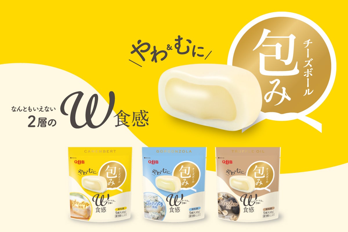 2021年9月にQBBから誕生した新感覚チーズボール「包み」。濃厚で滑らかなチーズソースを、もっちりとしたチーズ生地で「ギュッ」と包み込んだ新感覚商品です。2021年の発売までに7年間の試行錯誤の末に発売し、翌年にはミリオンセラーを達成しました。