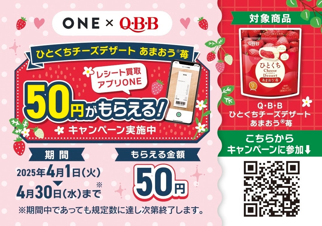 実施内容:レシート買取アプリ「ONE」で「ひとくちチーズデザート あまおう®苺」の購入レシートを撮影・アップロードで50~100円がもらえるキャンペーンを実施。