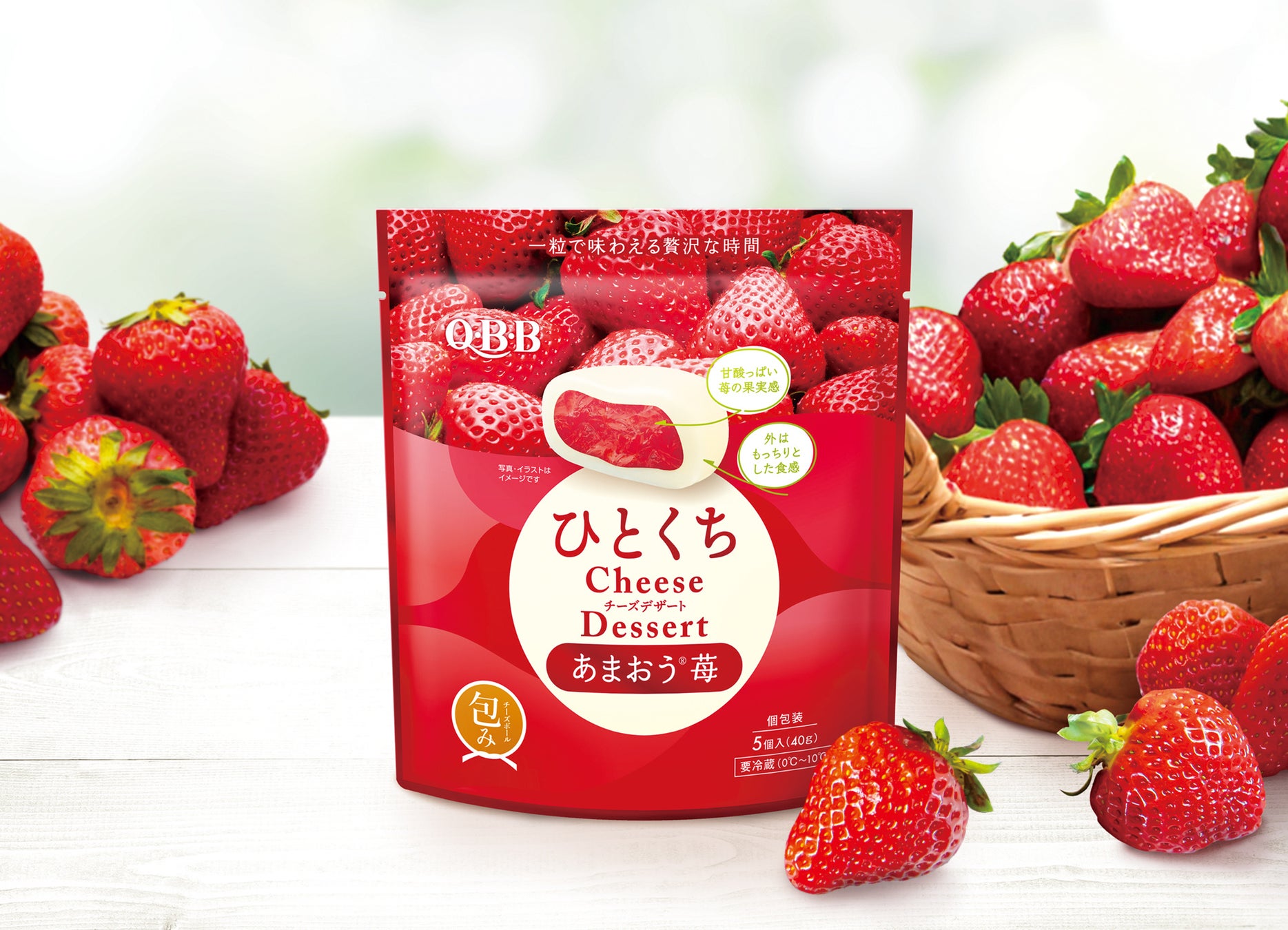 「QBB包み」シリーズはこれまで「カマンベール風味」「ゴルゴンゾーラ風味」「トリュフオイル入り」の3種を展開しておりましたが、今回シリーズ初となるデザートフレーバーとして「ひとくちチーズデザート あまおう®苺」を発売いたしました。
