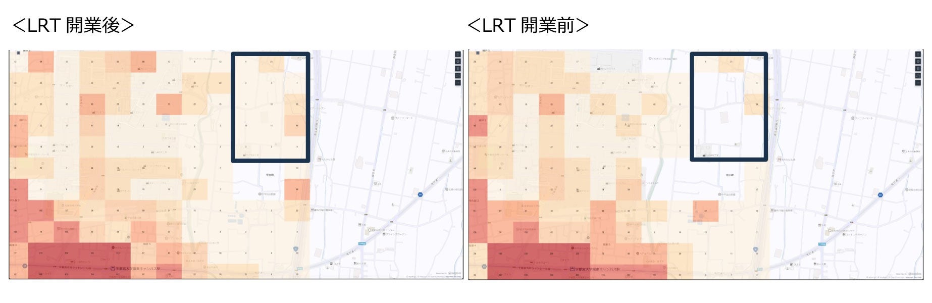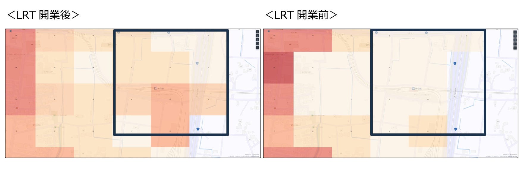 LRT路線から徒歩20分圏内では、滞在人口が最大40倍増加しているエリアが確認できました。