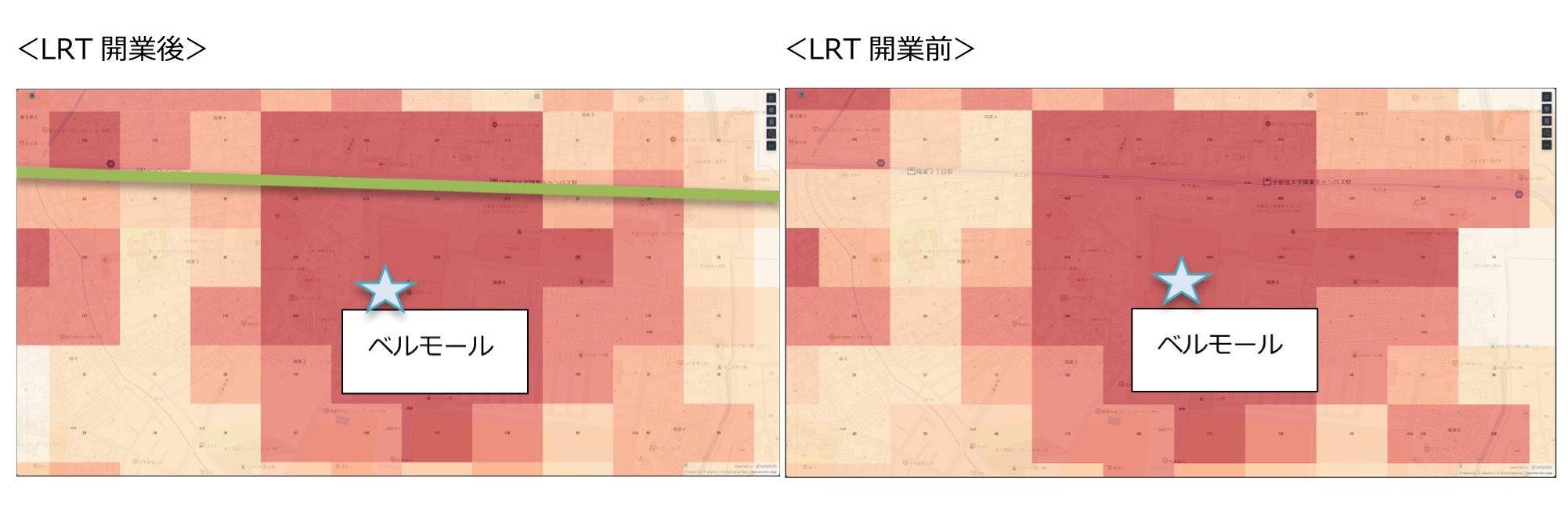 さらに、路線沿いのショッピングモール「ベルモール」付近では、最大120%増加していました。