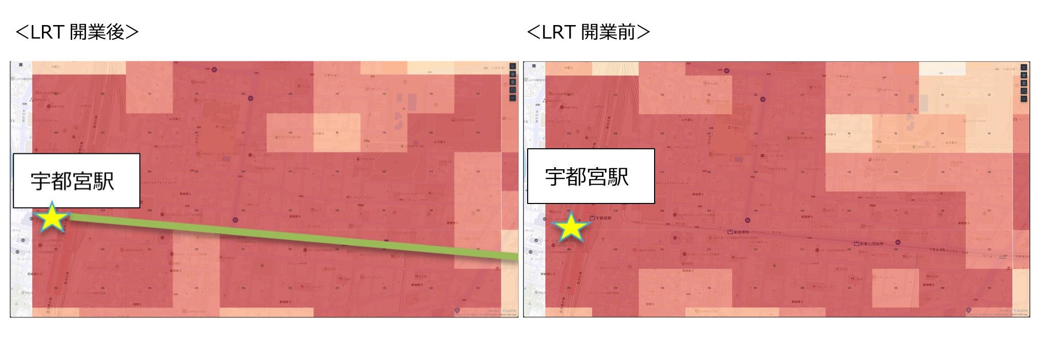 このサービスを活用し、今回は2023年8月26日(土)に開業した栃木県の次世代型路面電車システム「宇都宮LRT」周辺を独自に調査しました。