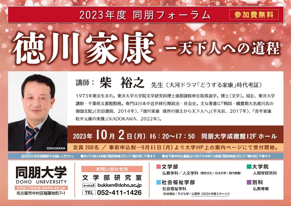 【同朋大学】講演会「徳川家康―天下人への道程」(講師:柴 裕之先生)を10月2日(月)に開催します
