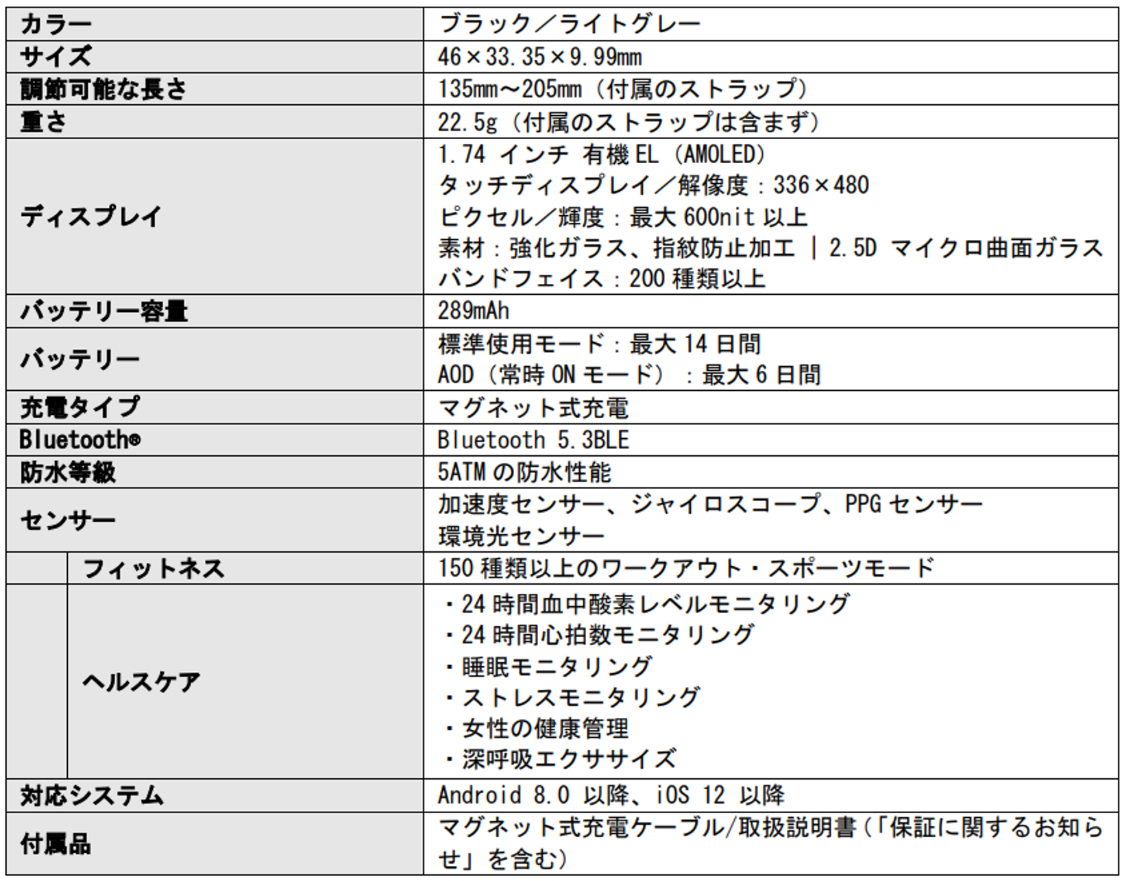 バッテリー持続時間は最大14日(標準使用モード)になり、前モデルに比べ2日延長しました。また、AOD(常時ONモード)でも最大6日間と、頻繁に充電をする必要はありません。また、ウォータースポーツでも安心の5ATMに対応しています。便利な、Alexaの音声アシスタントにも対応しています。