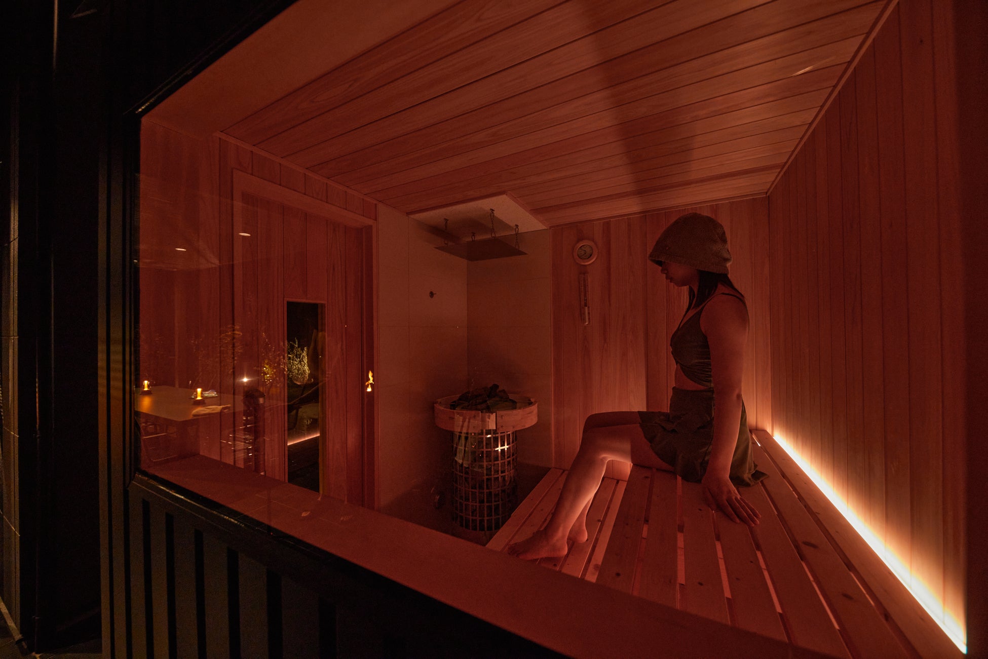 明るい木材をふんだんに使用したオリジナルデザインのプライベートサウナ。大きな窓ガラス越しに緑豊かな景色を望め、視界が開けた開放的な空間で、自然を感じながらゆったりと体を温めることができます。