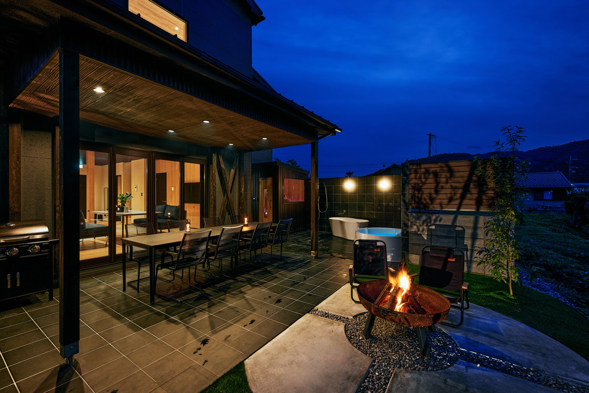 ジャグジーは夜になるとやさしい光で照らされ、水面にほのかな反射が広がります。白いジャグジーと黒のタイルが落ち着いたコントラストを生み、スタイリッシュでリラックスできる空間に。併設の焚き火を眺めながら過ごせば、穏やかに心身をほぐす夜のひとときをお楽しみいただけます。