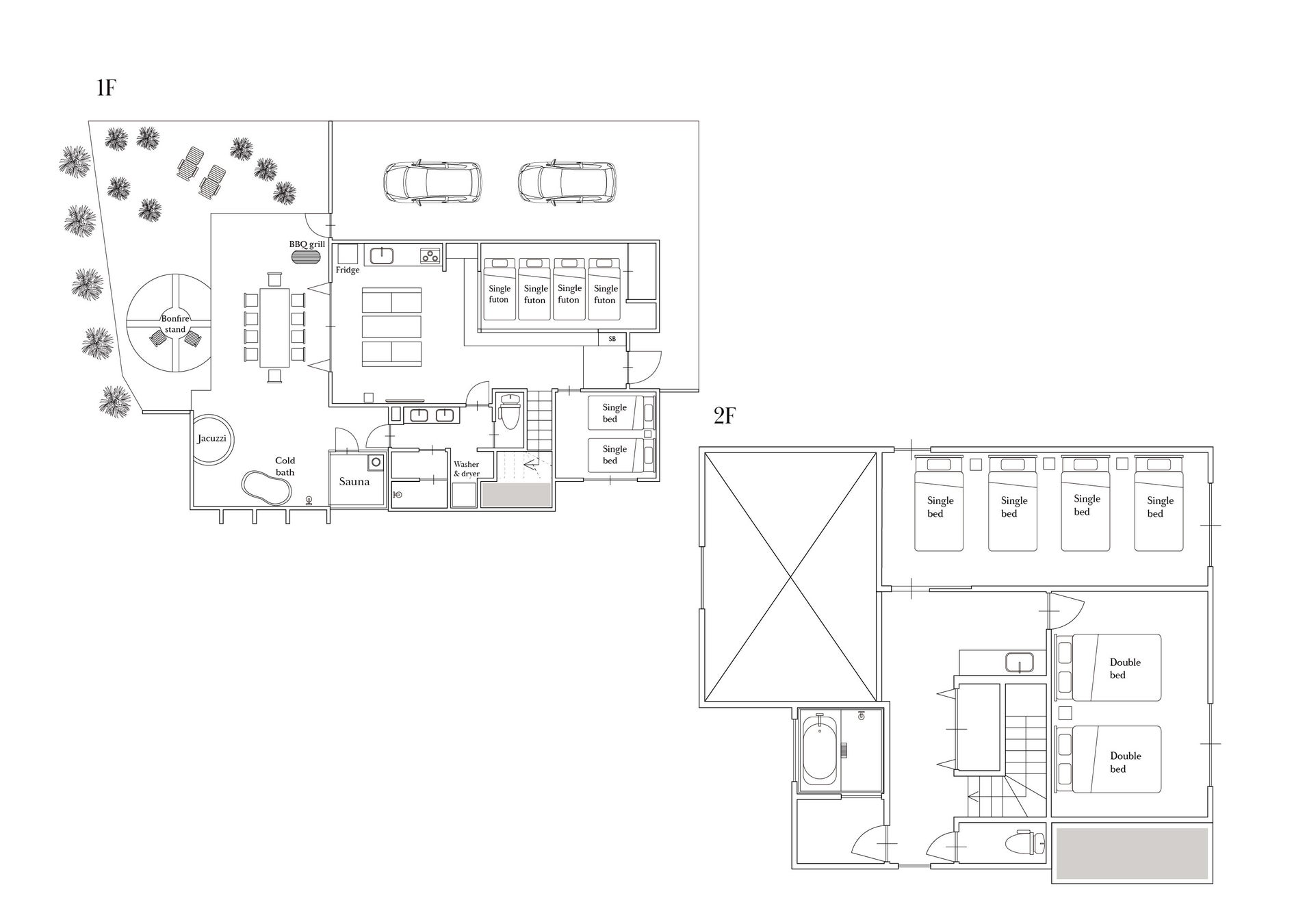 水回りは、最大14名までの宿泊に対応した快適な設計です。1階にはサウナ利用後に直行できる便利なシャワールームと、2人同時に使用できるダブルボウルの洗面台を備えており、混み合うことなくスムーズに身支度が可能です。シャワーや洗面への導線も工夫されており、サウナから出たあとも快適にリフレッシュいただけます。さらに、1階には洗濯機と乾燥機も備えており、長期滞在や家族・グループでの滞在でも快適にご利用いただけます。