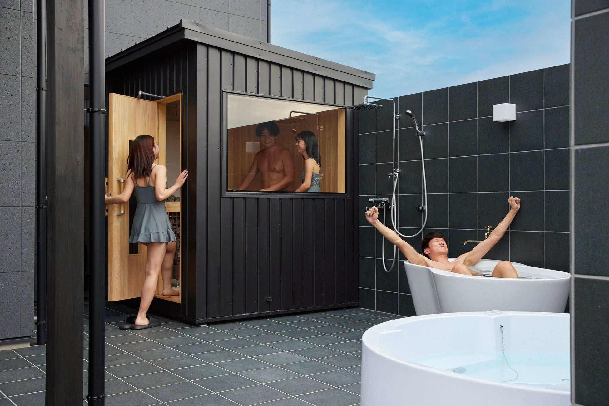 サウナ後は、隣接する水風呂やジャグジーでさっぱりリフレッシュできます。水風呂とジャグジーは白い浴槽に、床と壁には黒のシックなタイルを用い、モダンで洗練された雰囲気を演出しています。また、シャワーも1基完備。外気浴用に設置されたチェアに腰をかけ、風や光を感じながら、心身ともにゆるめるひとときをお楽しみいただけます。