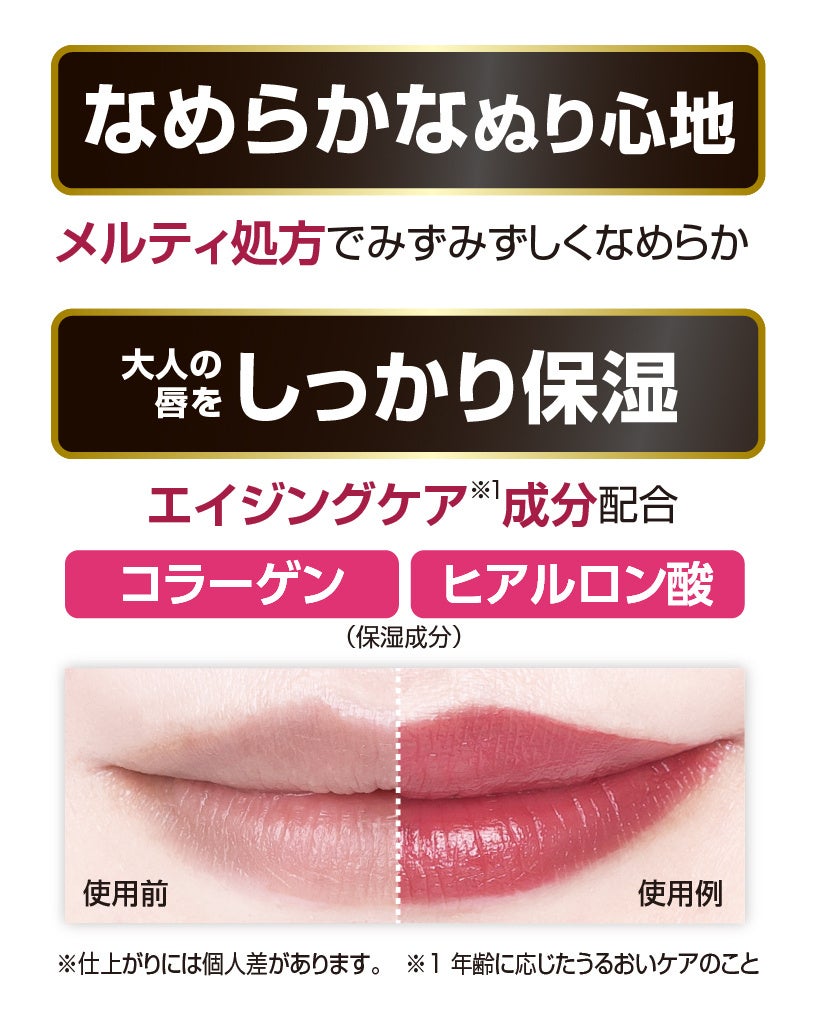 新たにメルティ処方採用で、するするとなめらかな塗り心地でうるおいのある唇に。エイジングケア成分配合(コラーゲン*3、ヒアルロン酸*4、セラミド*5:すべて保湿成分)で縦ジワふっくら。