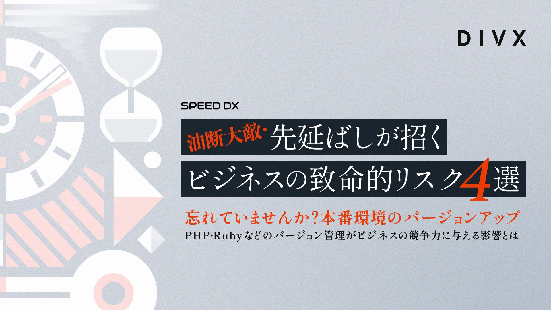 2021年に創業し、AIを活用したサービス開発を通じて民間企業や公共機関のDX推進を支援する株式会社divx(本社:東京都港区、代表取締役社長:物部 英嗣、以下「DIVX」)は、PHP・Rubyなどプログラミング言語のバージョンアップを怠ることで生じるビジネスリスクについて解説した無料ホワイトペーパー『油断大敵・先延ばしが招くビジネスの致命的リスク4選 〜忘れていませんか?本番環境のバージョンアップ〜』を公開しました。