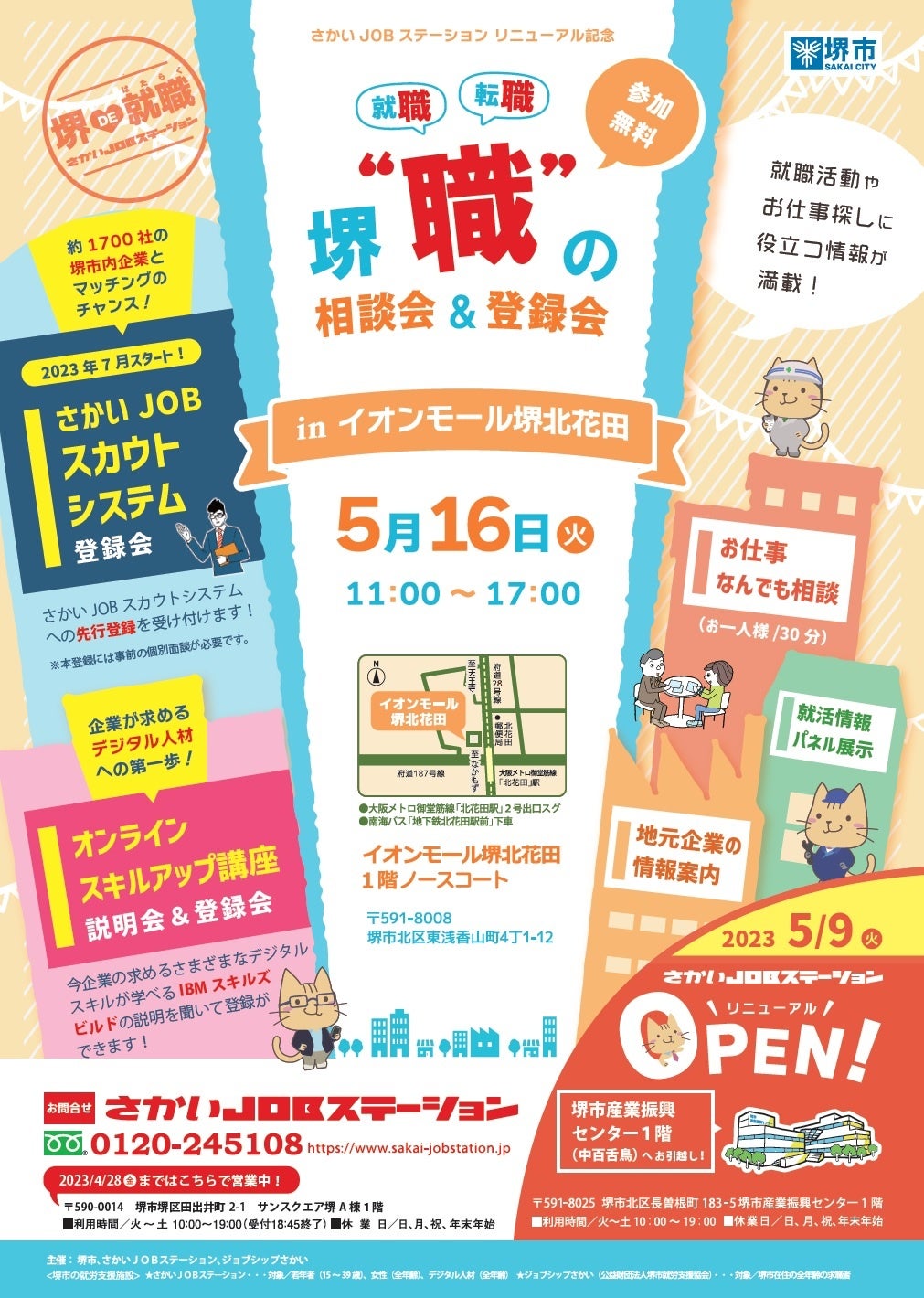また、中百舌鳥への移転やさかいJOBステーションの新たな支援サービスを周知するため、5月16日(火)にイオンモール堺北花田で、「堺”職”の相談会&登録会」を開催します。
